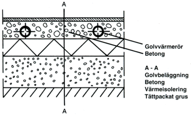 | På grund av värmeutvidning bör det gjutna golvet vila isolerat, flytande påkonstruktionen i övrigt. I konsekvens därmed bör olika golvvärmezoneranläggas åtskilda, så att det gjutna golvet inte spricker. Ytskiktet, ivilket värmerören läggs, bör göras tätt och möjligast tunt för bästamöjliga värmeöverföring och temperaturreglering. På golvytan kan i stort sett alla slags ytbeläggningar, såsom plattor,parkett, mattor osv användas. Det kan dock rekommenderas att man försäkrarsig om att materialet i fråga är godkänt för golvvärme. | | ![]() www.koppar.com | | | 12/99 ![]() | |